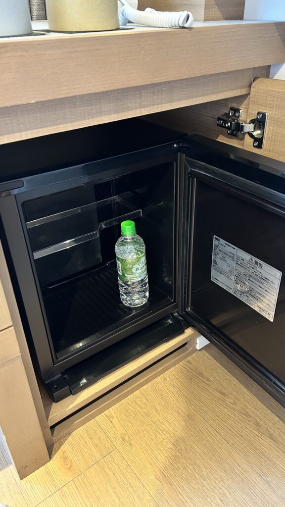 冷蔵庫にはお水のサービス、連泊した際も毎日もらえます。
